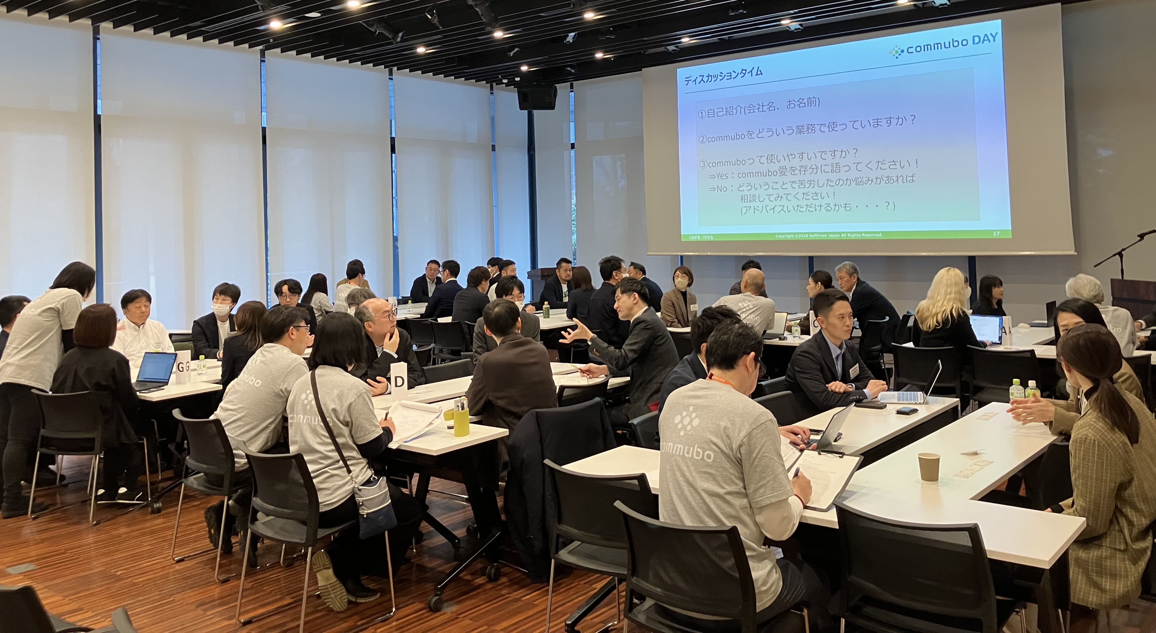 会の後半では、参加ユーザーとソフトフロントの社員による「お悩み共有・ディスカッションタイム!」を実施し、自社の業務利用の内容から、commuboの使い勝手、運用上の悩みなどをそれぞれグループごとに共有しました。